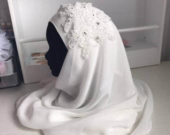 A white hijab with intricate lace details is draped over a mannequin head. The hijab is folded over the mannequin's shoulder, and the lace details are visible on the upper part of the hijab. The mannequin is placed on a white surface, and there is a white box with a lid in the background. | Lace jewel for wedding hijab hair jewel | 4954ad124c98c6d1bf51449671e79a9cbf320152c443593e184e89d3285d2130 | 001065740832 | 0 | 0 | 54 | 7 | 0 | 0 | |