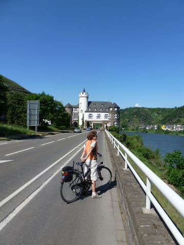 A person is standing next to a bicycle on a road with a clear blue sky above. The road is bordered by a fence and a body of water is visible in the distance. There is a building with a tower in the background, and a sign is visible on the left side of the road. | Lonniger House - nearby Koblenz and river Moselle | 11170119acdffc624bb19703ae84f673506e445cc99fc06abf67d4f00df063cd | 001065741084 | 0 | 0 | 56 | 8 | 0 | 0 | |