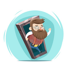 A stylized illustration of a man with a beard and glasses, wearing a vest and jeans, is depicted inside a smartphone. The man is holding the phone with his right hand, and his left hand is resting on the phone. The phone is floating in a blue background with a circular motion effect around it. | hipster wave hand mobile phone cartoon design vector image | b5fde7213c0f0f87783d8679d56aaf505a96f1b6ab34e18e5c6bb63dde97f9ea | 001065741065 | 0 | 0 | 55 | 9 | 0 | 0 | |