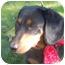 A close-up of a black and brown dachshund with a red bandana around its neck. The dog is looking directly at the camera with its eyes half-closed, giving a relaxed and friendly expression. The background is blurred, with hints of green grass and a clear sky. | Photo 3 - Dachshund Dog for adoption in Riverside, California - Mama Cass | 12f586d0e88f66b37a8e83cadc067e2b857a04fdf16c8002ba35291def6f8ad5 | 001065741057 | 0 | 0 | 46 | 13 | 0 | 0 | |
