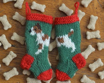 A pair of knitted socks with a dog pattern on them is placed on a wooden surface. The socks are green with red cuffs and a red stripe at the top. They are surrounded by various dog biscuits scattered around. | Jack Russell Terrier Dog Hand-Knit Christmas Stocking Ornament *Available to Order* | a68d104ac33d533cabc94e22eafe951c170b011e4d08f6ea89cec174ebdd380a | 001065741124 | 0 | 0 | 40 | 11 | 0 | 0 | |