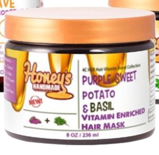 A jar of Honey's Naturals Purple Sweet Potato & Basil Vitamin-Enriched Hair Mask is displayed. The jar has a white label with a purple background and yellow accents. The label features the brand name 'Honey's Naturals' and the product name 'NanoMade Purple Sweet Potato & Basil Vitamin-Enriched Hair Mask'. The ingredients are listed, including 'Sweet Potato', 'Basil', 'Vitamin', and 'Hair Mask'. The jar is filled with a creamy, orange-colored product. | 4C Her Hair Vitamin Boost Collection, Purple Sweet Potato & Basil Vitamin Enrich | b06251e66ba07a9ddaf4f25e110f19c9fb2f565d9ed30d4d95f37e2a10b88fb7 | 001065741036 | 0 | 0 | 70 | 13 | 0 | 0 | |