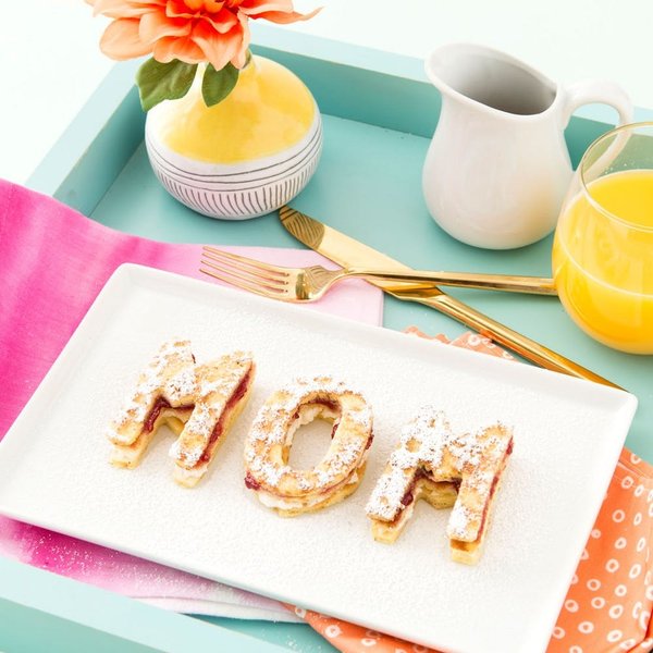 A breakfast scene with a white plate on a teal tray, featuring a waffle with the word 'Mom' spelled out in powdered sugar. The plate is accompanied by a fork, a spoon, and a knife. A glass of orange juice is to the right, and a white pitcher is to the left. A pink cloth napkin is partially visible at the bottom left corner. In the background, there is a vase with a single pink flower and a small yellow container. | How to Make Mom the Best Brunch on a $20 Budget | 1fa6ad8510722172141ca35ac6eecdcb27ea79ea2666e3bf3f46b066b126bba0 | 001065741017 | 0 | 0 | 81 | 11 | 0 | 0 | |