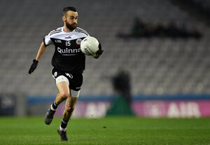 A soccer player in a black and white striped jersey is dribbling a white ball on a grassy field. The player is wearing black shorts and black socks with white stripes. In the background, there are several spectators in the stands, and the scene appears to be set during the evening or night time. | 19 January 2020; Conor Laverty of Kilcoo during the AIB GAA Football All-Ireland Senior Club Championship Final between Corofin and Kilcoo at Croke Park in Dublin. Photo by Piaras \xc3\x93 M\xc3\xaddheach/Sportsfile | 0058dc2e8f0dcccc336be266fc7b6e2a9ad14250cbf5ceb27bb3c479ec3b3b5d | 001065741015 | 0 | 0 | 54 | 31 | 0 | 0 | |