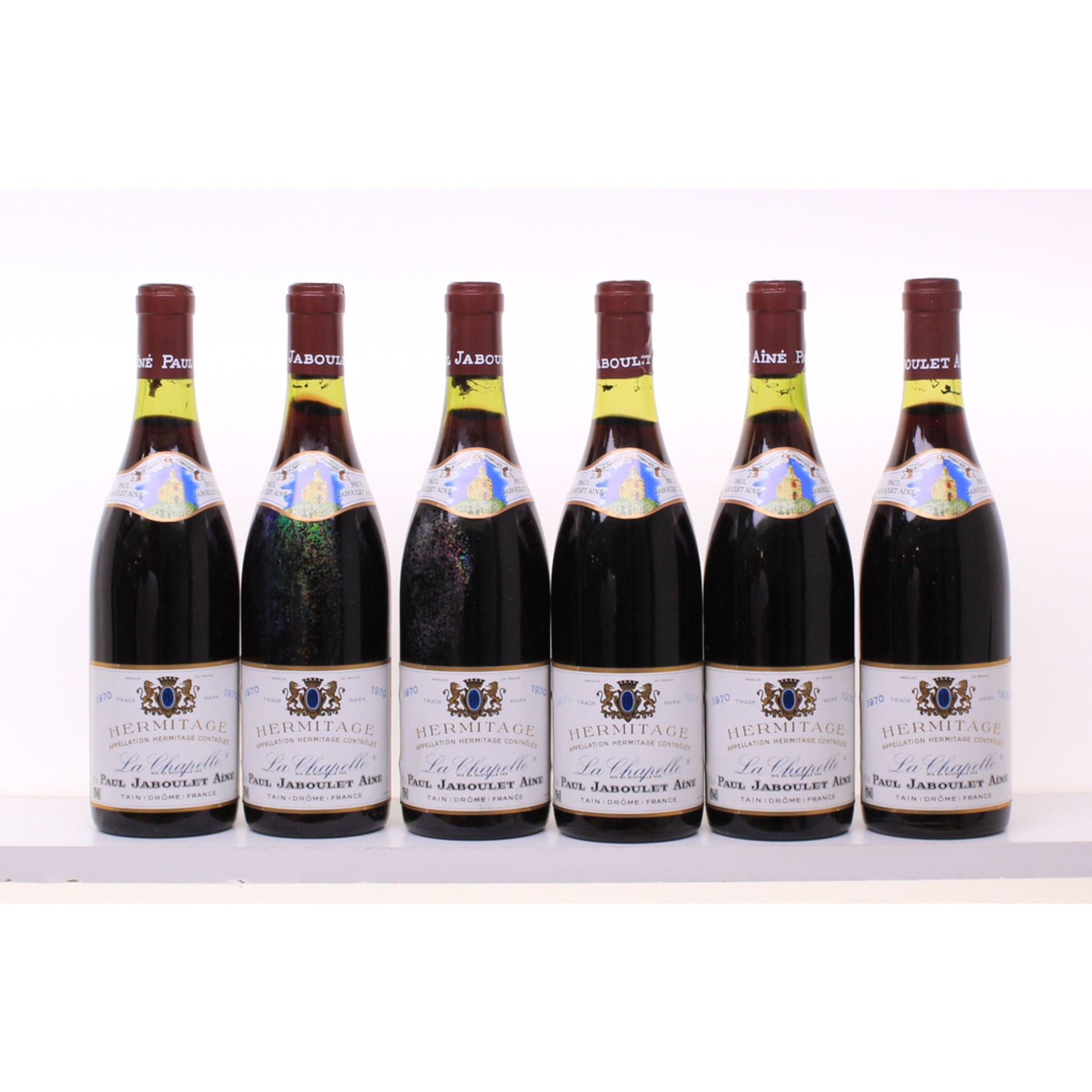 A row of six wine bottles with red labels and gold lettering, each with a cork stopper, are lined up on a white surface. The labels feature a blue crest and the text 'Le Ch\xc3\xa2teau' followed by a number. The bottles are arranged in a staggered manner, with the first and third bottles slightly overlapping the second and fourth, and the fifth and sixth bottles overlapping the fourth and second. | Wine Jaboulet Hermitage La Chapelle 1970 | b866480d8bc78db02ea8d636f40d2157b388e414a74fc9aed39ef131b0c5206f | 001065741169 | 0 | 0 | 70 | 6 | 0 | 0 | |