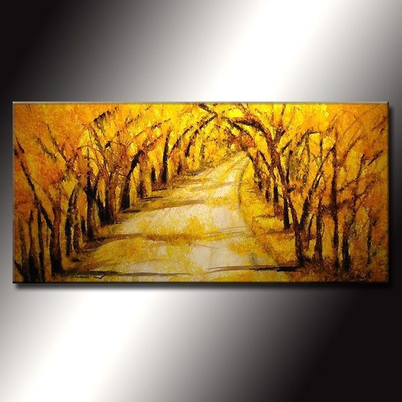 A textured painting of a winding road through a forest with trees on either side. The painting has a warm, golden color palette, with the road appearing to be made of a golden material. The trees have a yellowish hue, and the overall image has a textured, brushstroke effect. | Original Abstract Landscape Painting, Modern Tree Pathway Painting , Autumn Color painting by Henry Parsinia Large 48x24 Made to order | 2532b59a8cfc7268fce2b954780bbc4b2320a1c389f85626667afb1ea05b6bbf | 001065741024 | 0 | 0 | 49 | 20 | 0 | 0 | |