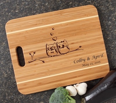 A wooden cutting board with a hand-drawn picture of two owls sitting on a branch, surrounded by hearts and leaves, with the words 'Colby & April' and the date 'May 22, 2015' written below. The cutting board is placed on a surface with a bottle of wine and a bunch of garlic cloves to the right, and a piece of broccoli to the left. | Personalized Cutting Board Engraved 15x12 Handle DESIGN 29 | 28d52862c5d168018df028f7daff87f85214d8f39f9e28d7c5da076a07c732f6 | 001065741274 | 0 | 0 | 64 | 8 | 0 | 0 | |