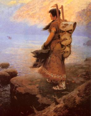 A person in traditional attire stands on a rocky shore, holding a spear, with a large, ornate backpack on their back. The scene is set against a backdrop of a calm lake and a sky with soft clouds, suggesting a serene, possibly prehistoric or historical setting. | Return of the War Canoes by William R. Leigh | 227c5a5e6b07726df2cfd006949c2e649f1de2c97b8b2cdef440284e23877491 | 001065741397 | 0 | 0 | 46 | 9 | 0 | 0 | |