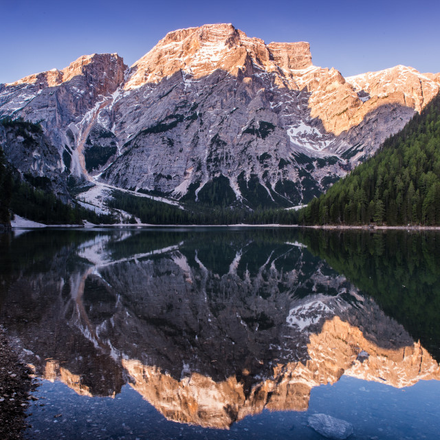 A serene mountain landscape with a clear blue lake reflecting the surrounding scenery. The mountains are covered with snow, and the sky is clear. The lake is calm, and the reflection of the mountains and trees is visible on the water's surface. | "Braies Lake - Dolomites" stock image | e2ef79136774616ced1bfb863d2b67cd64e6cf07247ab165e6e723ebedd0f7be | 001065741369 | 0 | 0 | 42 | 6 | 0 | 0 | |