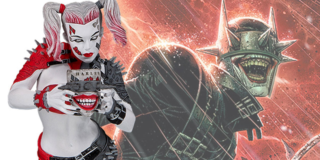 A comic book character with a red and black color scheme, featuring a woman with a red and black striped hairdo, red lipstick, and a black and red outfit with a red belt. She is holding a red and black striped baseball bat. In the background, there is a character with a green and black color scheme, featuring a green helmet with a black visor and a green and black striped suit. | DC Collectibles Introduces Batman Who Laughs Universe's Harley Quinn | 6ef969169609b04b662d8b4b3a19e767824820c356415fa5ff5e6186de2c5f4b | 001065741272 | 0 | 0 | 72 | 9 | 0 | 0 | |