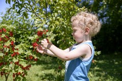 A young child with curly hair is reaching out to pick red berries from a tree branch. The child is wearing a blue sleeveless shirt and is standing in a grassy area. The background is filled with green foliage and more red berries on the tree. | Child picking currants in the garden Royalty Free Stock Photos | 2ef7aeec82f98f49c394462c8039bd9c267ae5e417e72ce4d9e5b8a40bd8404d | 001065741281 | 0 | 0 | 46 | 10 | 0 | 0 | |
