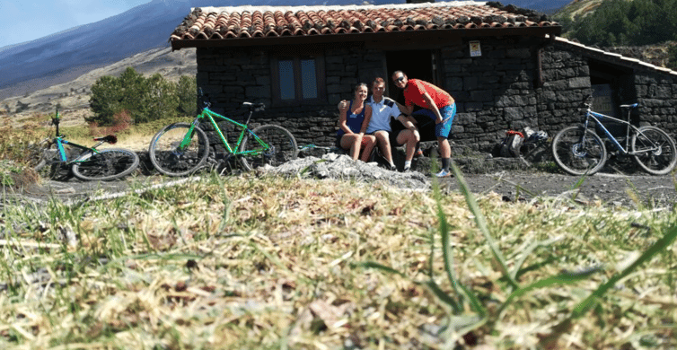 A group of three people is sitting on the ground in front of a stone house with a tiled roof. They are surrounded by several bicycles, with one person standing behind them. The house is situated in a mountainous area with a clear sky above. | Catania: Full Circuit of Etna in MTB | 7573ccb545c17b0c840c08879904d2a1ba8d920e1196bc4a31b2af1f36fd9f18 | 001065741542 | 0 | 0 | 45 | 7 | 0 | 0 | |