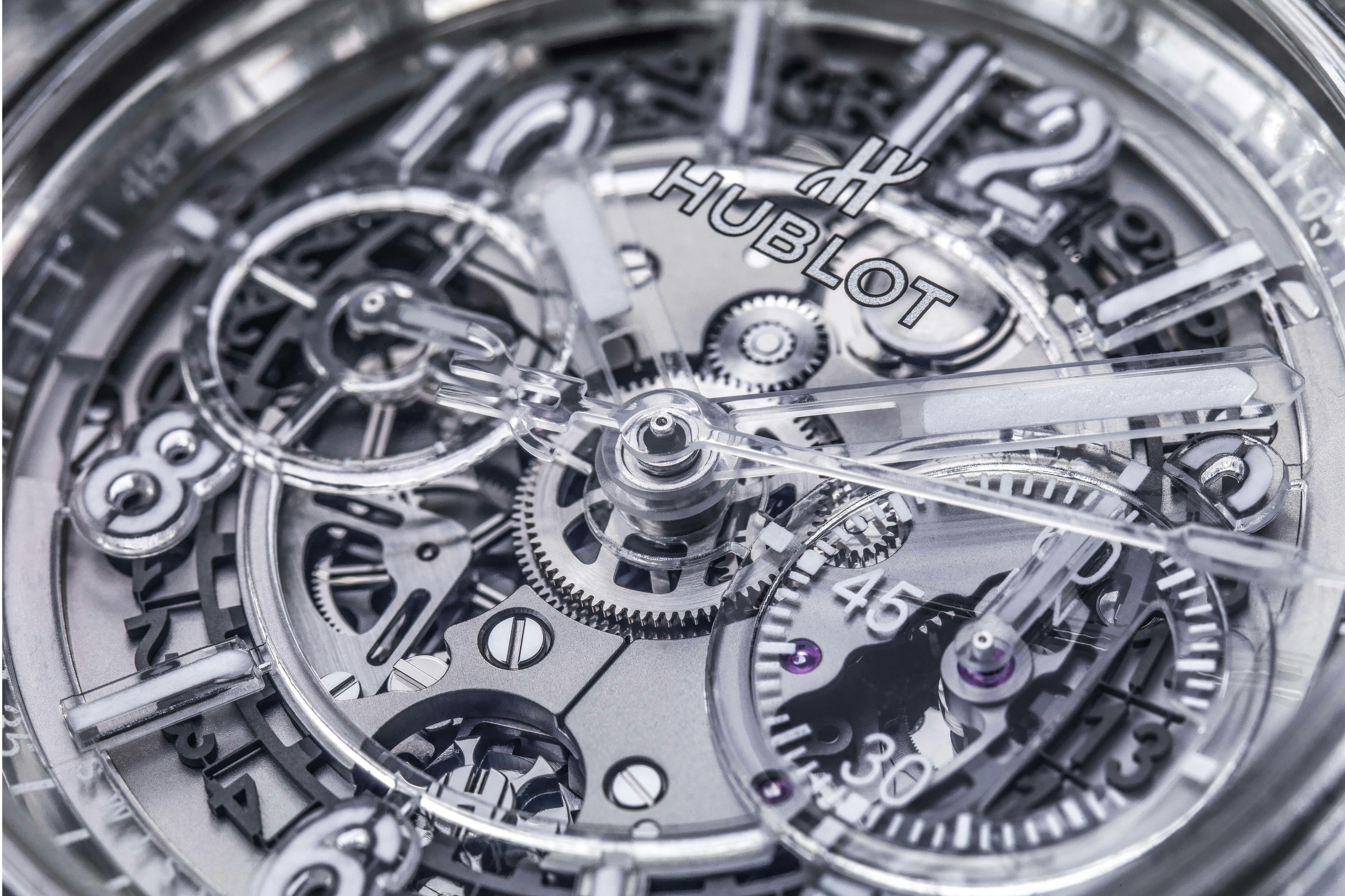 A close-up view of a mechanical watch with intricate gears and mechanisms visible. The watch face is white with black Roman numerals and hands, and the brand name 'Hublot' is engraved on the top. The watch has a silver and black color scheme, and the gears are detailed with various shades of silver and black. | Hublot Big Bang Unico Sapphire | e1c80fc41197bf8ae9d52a6c3f832274b31c69285d57a1b41a4fd9df9acd89aa | 001065741597 | 0 | 0 | 55 | 5 | 0 | 0 | |