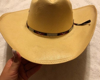A person is holding a yellow cowboy hat with a black band around the crown and a red and blue patterned band around the brim. | e6bc4f5ecf2b7 Stetson Straw Cowboy Hat | b56bba0f733108eb0fe9a64f15df508a8ff57c2b7fec40b368bc009c0fc0d53a | 001065741561 | 0 | 0 | 25 | 5 | 0 | 0 | |