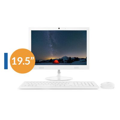 A modern computer setup with a white monitor displaying a night sky with stars and a tent silhouette. The monitor is placed on a white stand and is accompanied by a white keyboard and a white mouse on the right side. A circular orange sticker with the number '19.5' is placed on the lower left corner of the monitor. | All In One Lenovo Aio 330 / Celeron / 4 GB RAM / Intel Uhd Graphics 600 / 500 GB / 19.5" | 2e3822f6d70330af2a56f4cfadb98ee40fbaf788c600c913480514101c6716c8 | 001065741587 | 0 | 0 | 59 | 22 | 0 | 0 | |