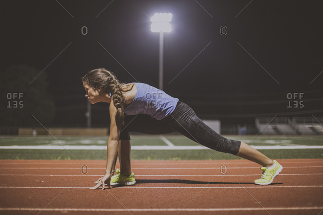 A young woman is in a starting position on a track field at night, wearing a blue tank top and black leggings. She has her hair tied back in a braid and is wearing green running shoes. The track is marked with white lines, and there are floodlights illuminating the area. The sky is dark, indicating it is nighttime. | Mixed race runner in starting position on sports field | 7aceb0bab6a61de2805825b88861a44429b7866bd3312031cbc21ac865ef3061 | 001065742299 | 0 | 0 | 59 | 9 | 0 | 0 | |