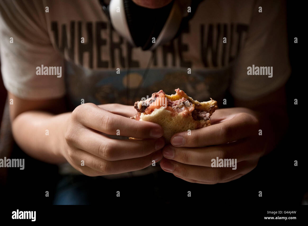 A person is holding a sandwich with both hands, wearing a shirt with the text 'WHERE THE WIT' on it. The person is also wearing headphones around their neck. | 19 year-old Miles Bowe eats a hamburger at Louis' Lunch in New Haven, CT, USA, 26 May 2009. Stock Photo | 7d22f518cc705c8ab9f9c0b5e159df3e50141a4ef32478e5e22980a044de2fbc | 001065742232 | 0 | 0 | 29 | 20 | 0 | 0 | |