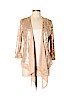 A beige cardigan with a shiny, sequined texture is displayed on a mannequin. The cardigan has a V-neckline and is draped over a white shirt. The mannequin is positioned against a plain white background. | Imaginary Voyage Women Kimono Size M | 1e03924b9335771ca320b92edad1defdd46b847573cc92d39dd8b964fc033819 | 001065742274 | 0 | 0 | 34 | 6 | 0 | 0 | |