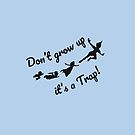 A whimsical illustration featuring a fairy with a wand flying above the words 'Don't Grow Up!' and 'It's a Trap!' The fairy is depicted with a playful expression, and the scene includes a small fairy and a bird in the background. The text is written in a cursive, childlike font, and the entire image is set against a light blue background. | Don't grow up, it's a Trap! by Marco Ferruzzi | 7f252ae5ce22dc58eda61f7c5650f3f1e298e47a3fdee9f6c9a8f9c4e8379d6f | 000910699879 | 0 | 0 | 61 | 9 | 0 | 0 | |
