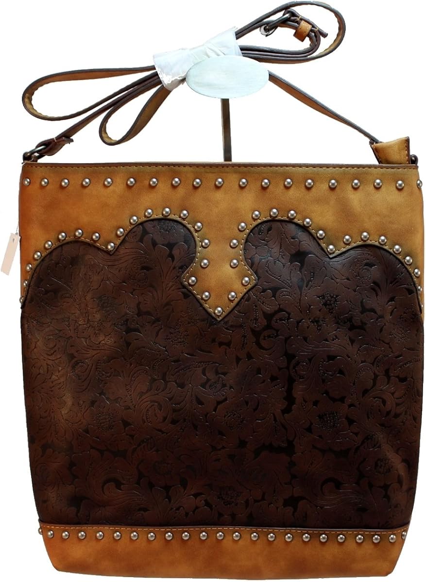 A brown leather handbag with a unique design featuring a central diamond-shaped pattern and a fringe on the top. The bag has a silver buckle and is adorned with silver studs along the edges. | Faux Leather Tooled with studd accents Small Cross Body Purse Handbag | 0ef477c22b31a6a7e07193d7c8c1dbba879b6cb3879025548d52ef270f809217 | 000910699926 | 0 | 0 | 34 | 11 | 0 | 0 | |