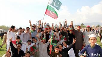 A large group of people is gathered outdoors, celebrating with their hands raised in the air. They are holding a flag with a green and white design, which appears to be the flag of Pakistan. The crowd is diverse, with individuals of various ages and ethnicities. Some are wearing traditional Pakistani attire, while others are dressed in casual clothing. The atmosphere is festive and joyful, with the group seemingly united in their celebration. | Khan's supporters in Swat Pakistan | 809c821abe310fb33bb3139084547ec73d916257ecefeac7e625762e32d36b3b | 000910701807 | 0 | 0 | 73 | 5 | 0 | 0 | |