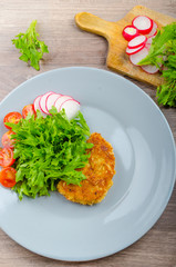 A plate with a piece of fried fish and a salad of shredded lettuce and thinly sliced red onion is on a wooden table. There is a wooden spatula to the left of the plate and a small pile of shredded lettuce to the left of the spatula. | Breaded pork chops in Parmesan cheese | 5a0bcf504883f6edc76aadbe03e282668b62d4db1a373dc1100c336ff52ca0fa | 000910701785 | 0 | 0 | 48 | 6 | 0 | 0 | |