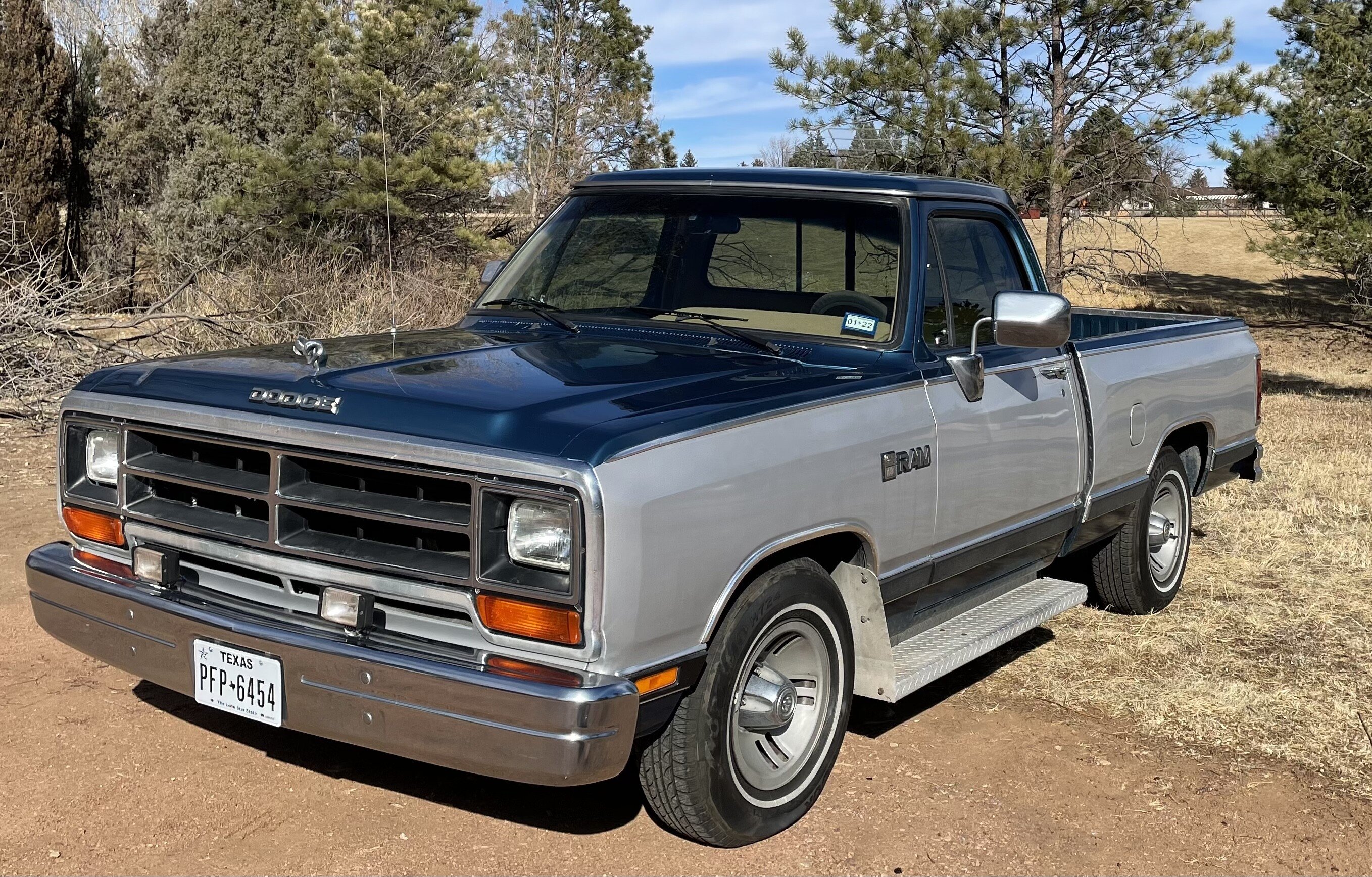 A silver pickup truck is parked on a dirt road with a clear blue sky above. The truck has a black grille, a side mirror, and a license plate that reads 'HJ 4'. The truck is surrounded by trees and bushes, and there is a house visible in the background. | 1989 Dodge D/W Truck 2WD Regular Cab D-150 | d842c147d1b77f46976f8863bb5d0453cfb42b95625282a8a1328954b9c159aa | 000910702025 | 0 | 0 | 50 | 8 | 0 | 0 | |