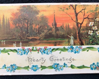 A vintage postcard with a scenic illustration of a river, trees, and a church in the background. The postcard features a decorative border with blue flowers and the phrase 'HEARTY GREETINGS' at the bottom. The image has a warm, sepia-toned color palette, and the postcard appears to be aged with some wear and tear. | 1908 Hearty Greetings Postcard | 88e9a67d41f83d912dc48cb4c4d6a7c3b589389eefa568cb85e83c9250e53467 | 000910701795 | 0 | 0 | 54 | 4 | 0 | 0 | |