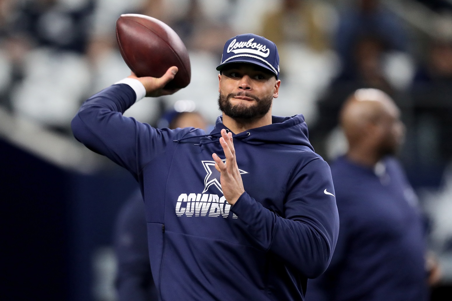 A football player in a blue and white jersey is holding a football with his right hand, preparing to throw it. He is wearing a navy blue hoodie with the word 'Cowboys' on it, and a navy blue cap with a white logo. The player is surrounded by a crowd of people in the background, and there is a stadium with seats visible in the distance. | Dak Prescott Cowboys contract message | 598b1f72be462fc2f963fd74e9d14a3f457c6b3d4d8110c66f3cb1183fd33219 | 000910702064 | 0 | 0 | 66 | 5 | 0 | 0 | |