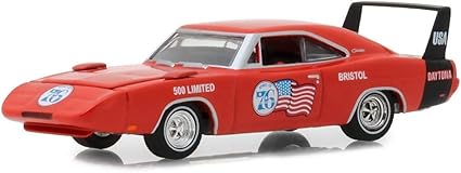 A red toy car with a white stripe on the side is displayed against a white background. The car has a detailed design with a windshield, side windows, and a door that is open. The license plate reads 'BOSTON' and there is a sticker on the side with an American flag design. The car has white tires and is positioned on a surface that reflects the light, giving it a shiny appearance. | 1969 Dodge Charger Daytona Spirit of 76 Bristol 500 Limited Orange Hobby Exclusive 1//64 Diecast Model Car by Greenlight 29969 | 8d44d8631a0c75fb7df24b7be7950c72bc66566bc080a48cd2e3f640f41c44c3 | 000910702181 | 0 | 0 | 72 | 20 | 0 | 0 | |