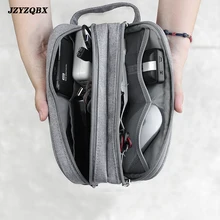 A hand is holding a gray fabric pouch with a zipper, which is open to reveal various electronic devices and accessories inside. The items include a smartphone, a camera, a pair of earphones, a mouse, and a small notebook. The pouch has a strap with a buckle and is placed against a white background. | Fashion Travel Digital Accessories Storage Bag Large Capacity IPad Power Adapter Cell Phone Electronics | 32809e98aa51562cfafe31380bd36a57e5d0885e0092e6d9075952968511ea87 | 000910702292 | 0 | 0 | 54 | 14 | 0 | 0 | |