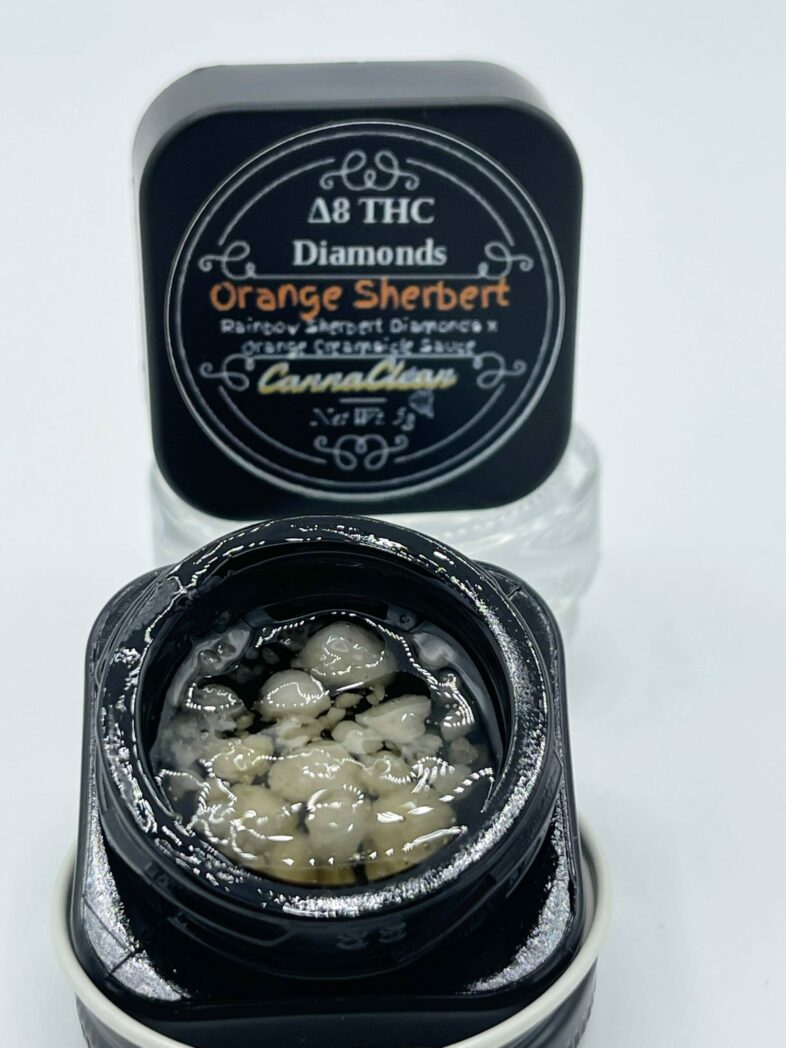 A close-up image of a small, round container with a black lid, filled with a white substance that resembles a creamy paste. The container is labeled 'A8 THC Diamonds Orange Sherbet' with a decorative design around the label. The background is a plain white surface. | Delta-8 THC Diamond Sauce - CBT/CBN/CBG Infused - Orange Sherbert - LIMITED RELEASE! | 1249040b7df74819626e2d8a4d74b7719f1f07927f96e759bb1e297a173913a3 | 000910702264 | 0 | 0 | 45 | 13 | 0 | 0 | |