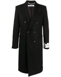 A black, long-sleeved, double-breasted coat with a peak lapel and a belt at the waist. The coat has a white label on the inside, a red pin on the left side, and a white and black patterned patch on the right sleeve. | Off-White c/o Virgil Abloh Men's Omer003e20fab0011001 Black Wool Coat | 38ad636d773fad38127c0bc39b597010fc59c954c3653d68af0f2aba648f2748 | 000910702321 | 0 | 0 | 42 | 9 | 0 | 0 | |