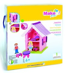 A child's playset with a pink house and various accessories is displayed in a box. The box has a yellow background with a 'Make Me' logo and colorful illustrations of the playset's components. The playset includes a house with a purple roof, a pink bed, a pink chair, a pink table, and a pink toy car. There are also two dolls, one with blonde hair and the other with brown hair, and a boy doll with brown hair and a red shirt. The box has instructions and a warning label on the back. | Kinder Bastelsets / Kids Craft Kits Craft Kit, KitsforKids Moosg.3D dukkehus. | 08b5bdbaa61065dec9675b55354509a0561100c6fc86643a9106f35690507ddb | 000910702274 | 0 | 0 | 93 | 11 | 0 | 0 | |