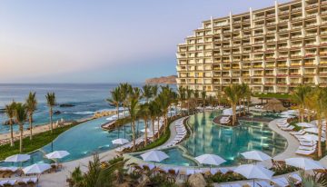 A luxurious resort with a large swimming pool surrounded by numerous sun loungers and umbrellas. The pool is situated on a cliff overlooking the ocean, with a clear blue sky above. The resort building is large and multi-storied, with a flat roof and a balcony. The ocean is calm with a visible horizon line, and the beach is lined with palm trees. | Calling All Wine Lovers! You\xe2\x80\x99re Going to Love This Cabo Wine Trip | 8d311e0356af80d1ec39ad0b030e6713d8a38b3001a252b0b3a9d95c90c265de | 000910701262 | 0 | 0 | 62 | 12 | 0 | 0 | |