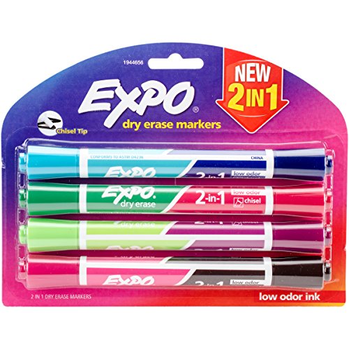 A pack of Expo dry erase markers in various colors is displayed. The markers have a purple and pink background with the Expo logo and the words 'Dry Erase Markers' written in white. The markers are in a plastic container with a clear plastic lid, and the packaging has a 'New 2-in-1' label on the top right corner. The markers are arranged in a way that the tips are visible, showcasing the different colors. | EXPO 1944656 2-in-1 Dry Erase Markers, Chisel Tip, Assorted, - Erase Pink Markers Dry | d55f601299eb026154b8659a19ed584cc9961ad15568aa57cc6b19b1a9204686 | 000910686596 | 0 | 0 | 74 | 14 | 0 | 0 | |