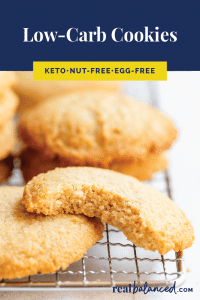 A collection of low-carb cookies is displayed on a wire cooling rack. The cookies are golden brown and appear to be made with a nut-based dough. The image is overlaid with text that reads 'LOW-CARB COOKIES' and 'KETO NUT-FREE EGG-FREE'. The text also includes a website URL at the bottom right corner. | Low-Carb Cookies pinterest pin image | 0c2a24028fcbefe6a0569b8c6daa033c8dd67def303b4480bf897d810a5821b0 | 000910686610 | 0 | 0 | 52 | 5 | 0 | 0 | |
