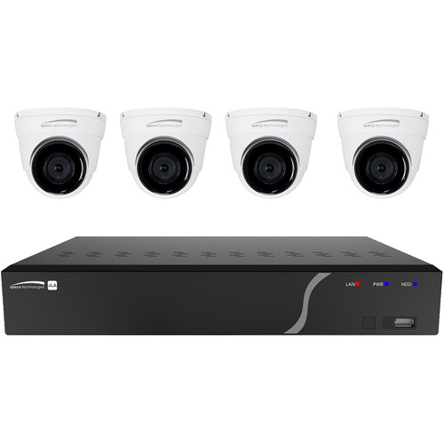 A set of four security cameras is displayed on a white background. The cameras are mounted on a black base with a sleek design, featuring a blue LED light on the front right side. Each camera has a white dome-shaped housing with a black lens and a small black logo on the side. The cameras are arranged in a vertical line, with the first camera on the left and the fourth on the right. | Speco Technologies 4-Channel 5MP NVR with 1TB HDD & 4 5MP Outdoor Network Turret Cameras | 77c8c58b8676e67a65890d00e333a01f1d53f684618e95467b8ff8d6de28ae00 | 000910686652 | 0 | 0 | 74 | 15 | 0 | 0 | |
