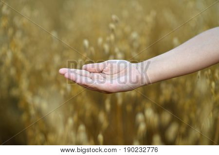 A close-up of a person's hand holding a small object, with a blurred background of a wheat field. The hand is positioned in the center of the frame, with the object held between the thumb and index finger. The background features a field of wheat with varying shades of yellow and green, and the overall image has a warm, golden tone. | close up view of child holding open palm against field of ripe wheat | 4cc94aa30815f614340291d4825835752e60f5a689adf48a413c70b9d6240247 | 000910686593 | 0 | 0 | 61 | 13 | 0 | 0 | |