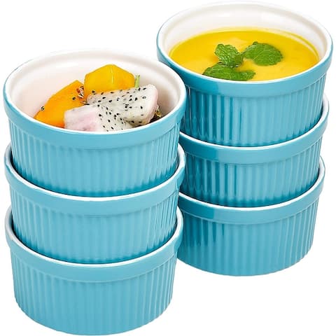 A stack of four blue bowls filled with different foods. The top bowl contains a yellow substance with mint leaves on top. The second bowl from the top has a mix of white and yellow food with mint leaves. The third bowl has a mix of white and yellow food with mint leaves, and the bottom bowl has a mix of white and yellow food with mint leaves. | Bruntmor Ceramic Ramekins Souffle Dishes, Ramekins - 8 Ounce for Baking - 8 Ounce Ceramic Ramekins | 5caebed4b64ce5f4223beca5af1f2698f34159b9ca1f9f0b6e702948935b7202 | 000910702414 | 0 | 0 | 68 | 16 | 0 | 0 | |