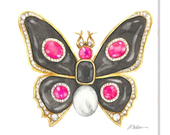 A detailed illustration of a butterfly with black wings adorned with pink and red gemstones, a white and black body, and a pink gemstone on its head. | Butterfly Brooch Watercolor Rendering in Yellow Gold with Black Onyx, Pink Spinels, Diamonds, and Pearl printed on Canvas | 069dcfa6047679bd6d55fcbb47ecf520cf61017e07f3e964656d549873ecfe4a | 000910702415 | 0 | 0 | 27 | 18 | 0 | 0 | |