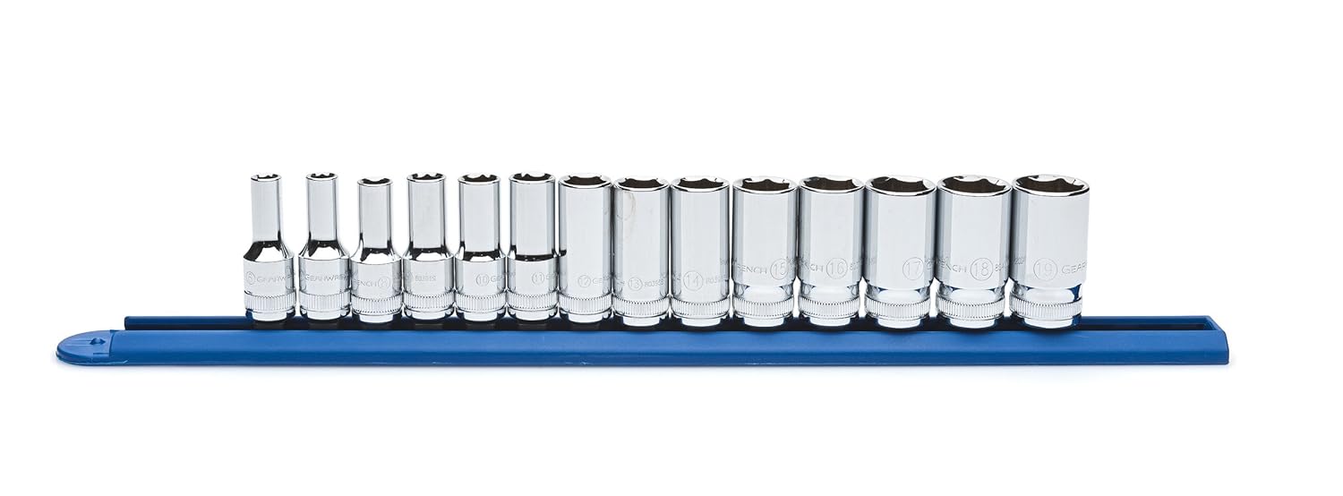 A set of shiny, new-looking metal tools is neatly arranged on a blue plastic holder. The tools appear unused and are in pristine condition. | GearWrench 80554S 14-Piece 3/8-Inch Drive 6-Point Mid Length Socket Set Metric | a37b85781dffd09e0366d50eeb24724a9f16ddc979f28ed315125802cd80a6fb | 000910702489 | 0 | 0 | 24 | 11 | 0 | 0 | |