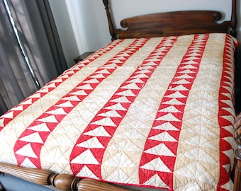 A wooden bed with a red and white quilted comforter featuring a geometric pattern. | 1920s Handmade Quilt, Vintage Patchwork Bedding, Cutter Upcycling Restoration Quilt, Hand Stitched Bedspread, Red Beige Arrows | 19830d6d4cb0d2cd07fa6a586be89ce34cc2de790a7ddea842946cae011300db | 000910702419 | 0 | 0 | 14 | 16 | 0 | 0 | |