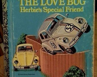 A vintage children's book cover titled 'The Love Bug: Herbie's Special Friend' featuring a cartoon image of a Volkswagen Beetle with a smiling face and a '3' on its side, with a smaller yellow car in the background. The book has a blue cover with a wooden fence and green trees in the background. | Little Golden Book, Walt Disney's The Love Bug Herbie's Special Friend,#D130, 1st Edition | 8d1591ff357de3f0166d0bfb8fd05c244420ca8141417eb1317e691799efdc57 | 000910702440 | 0 | 0 | 54 | 13 | 0 | 0 | |