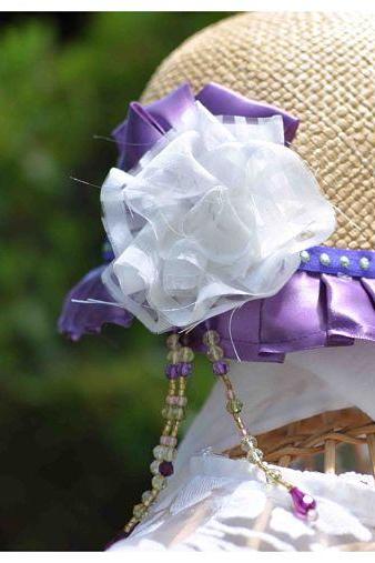 A close-up view of a straw hat adorned with a large, white, ruffled flower embellishment. The flower is attached to the hat with a purple ribbon and a string of beads. The hat is placed on a surface with a blurred background, and the focus is on the intricate details of the flower and the beads. | Great Gatsby altered straw hat | 18b1080aa3179c17f43b349aa8dadf2b73856a27a4198748bbf062aafc6529f4 | 000910703022 | 0 | 0 | 56 | 5 | 0 | 0 | |