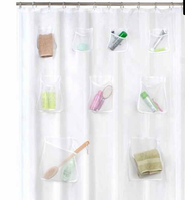 A shower curtain with various toiletries hanging from it. The toiletries include a bottle of shampoo, a bottle of conditioner, a bottle of body wash, a bottle of hand soap, a bottle of lotion, a bottle of facial cleanser, a bottle of facial moisturizer, a bottle of hair serum, a bottle of hair gel, a bottle of hair spray, a bottle of hair mousse, a bottle of hair wax, a bottle of hair pomade, a bottle of hair oil, a bottle of hair conditioner, a bottle of hair mask, a bottle of hair treatment, a bottle of hair serum, a bottle of hair | Organizing shower curtain with nine pockets in three sizes for your personal care items. ($19.85)\n\nhttp://www.amazon.com/gp/aw/d/B003ZHVDAG/ref=mp_s_a_1_1?qid=1455665870&sr=1-1&pi=AC_SX236_SY340_FMwebp_QL65&keywords=maytex+mesh+pockets+peva+storage+shower+curtain+clear | 340a3097beab11ef5a6bff10bb9849f89120152daa1401a09f7096422c3ac671 | 000910702980 | 0 | 0 | 103 | 15 | 0 | 0 | |