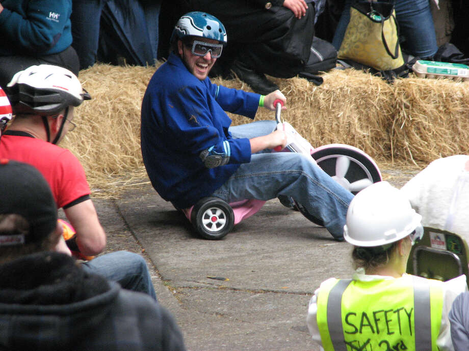 A man in a blue shirt and jeans is sitting on a pink tricycle with a white helmet on his head. He is smiling and appears to be enjoying himself. There are several people in the background, some of whom are wearing hard hats. The scene appears to be a competition or event, with a crowd watching the man on the tricycle. | Big wheel event, Potrero Hill, Mar. 31, 2013; it's easy to collide with the side barrier | 78c195a286488f17bcc1c73a6637afe28c0c86dce7edda64d6f1cb7d5a219db9 | 000910703132 | 0 | 0 | 62 | 16 | 0 | 0 | |