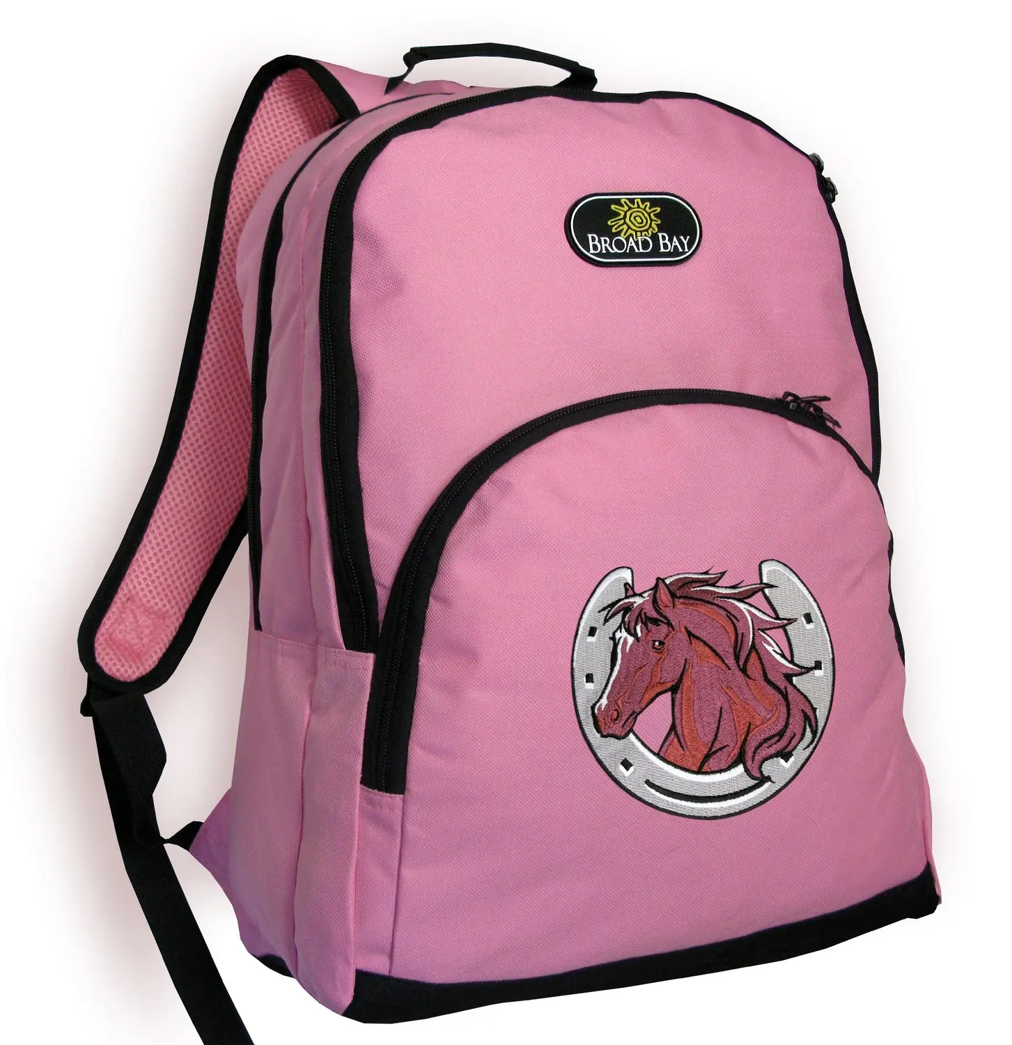 A pink backpack with a black trim and a silver buckle is displayed against a white background. The backpack features a large, circular logo on the front, which depicts a horse's head with a red mane and a white star on its forehead. The logo is surrounded by a black border. The backpack also has a smaller logo on the top right corner, which reads 'BICAY' in black letters. | 1c5deaf580 Get Quotations \xc2\xb7 Horse Theme Backpack CUTE PINK Horse design School Bag - Travel Bag | 5b666073fef26b51fa707a13c4e4a70849268d7725b95c9da99304c48e02bb49 | 000910703047 | 0 | 0 | 69 | 16 | 0 | 0 | |