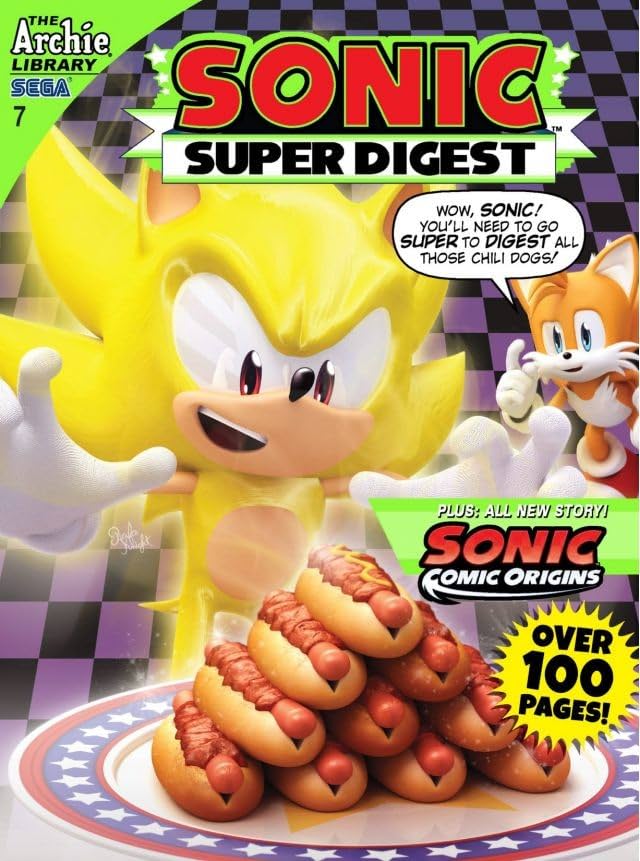 The cover of 'The Archie Sonic Super Digest' featuring Sonic the Hedgehog in a yellow and white color scheme, with a playful expression and a stack of hot dogs in the background. The title 'Sonic Super Digest' is prominently displayed in bold letters, and the tagline 'WONDER, SONIC! SUPER TO DIGEST ALL THESE CHILL DOGS!' is written in a comic book style. The image has a comic book aesthetic with a checkered pattern in the background. | Sonic Super Digest #7 | a8e7159e6c629c3d83697ad6d8c30f4d15e976a86a4fb1afeb33749f2118d6b2 | 000910703374 | 0 | 0 | 76 | 4 | 0 | 0 | |