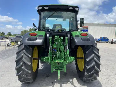 A green John Deere tractor is parked in front of a building with a blue roof. The tractor has a large front grille with two headlights and a steering wheel. The rear of the tractor has two round taillights and a license plate. There are several cars parked in the background, and the sky is partly cloudy. | 2021 John-Deere 6130R for sale | 4797aae50eb5b9ba907b8b95a879d09664457c217557f4a8fea119dafb897c2c | 000910703384 | 0 | 0 | 57 | 5 | 0 | 0 | |